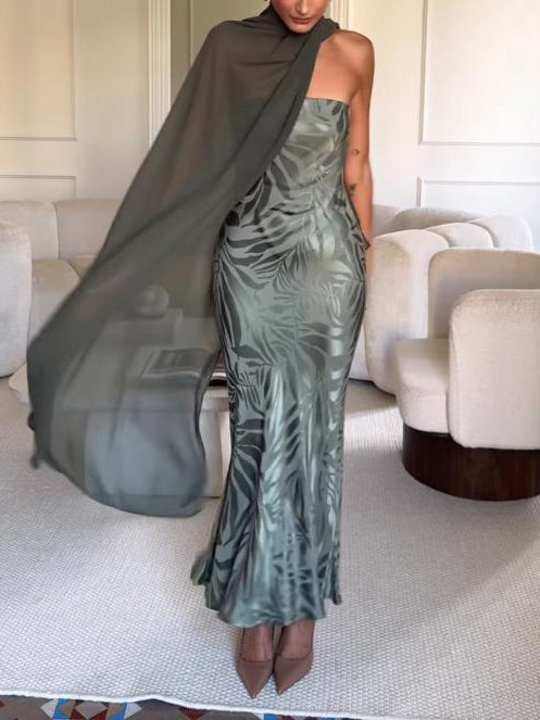 This elegant off-the-shoulder maxi dress is crafted from luxurious satin jacquard, showcasing an intricate texture with a soft, shimmering finish.