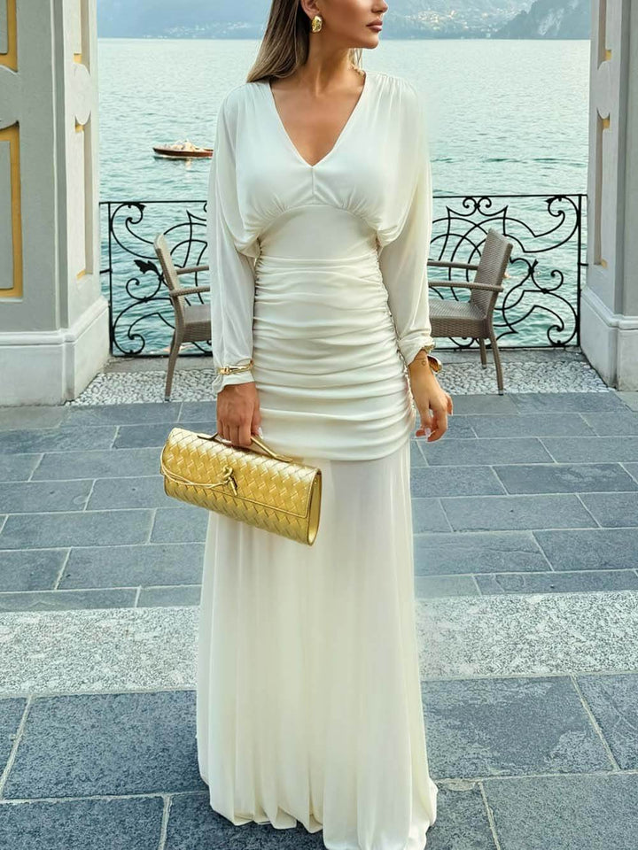 Beautifully Pleated Draped V-Neck Batwing Sleeve Maxi Dress