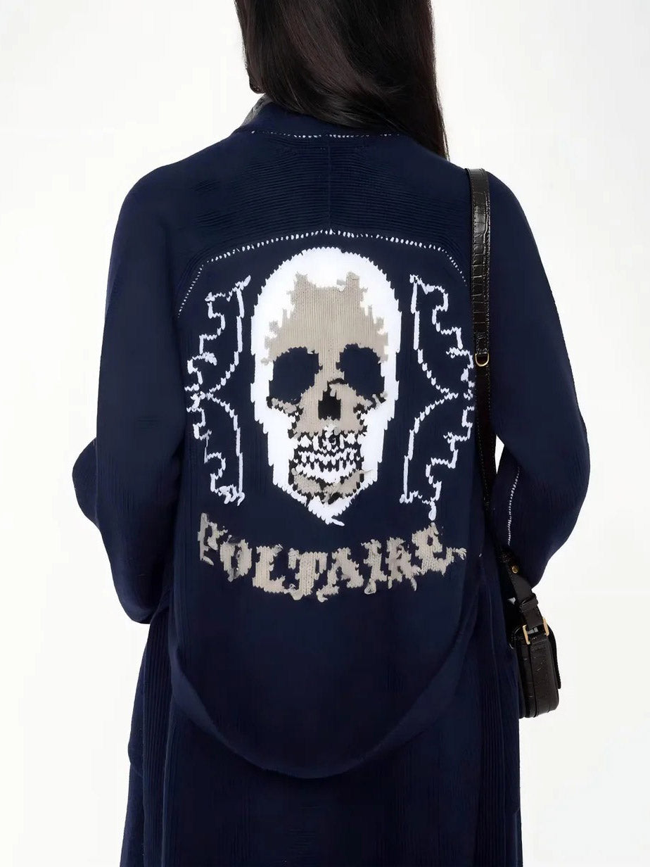 Elevate your casual style with this intarsia skull knit long cardigan. Designed with a relaxed fit and open front, it combines comfort with a bold, edgy vibe. Perfect for layering over tees or dresses, this versatile piece adds a unique statement to your everyday wardrobe.