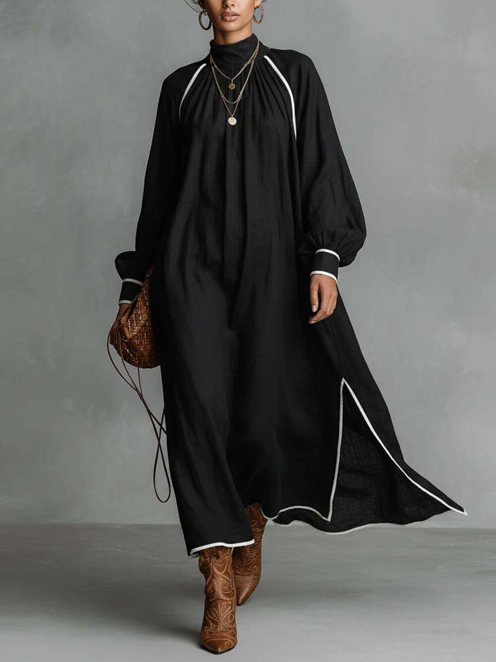 Casual Loose Linen Contrast Trim White Piping Slit Maxi Dress