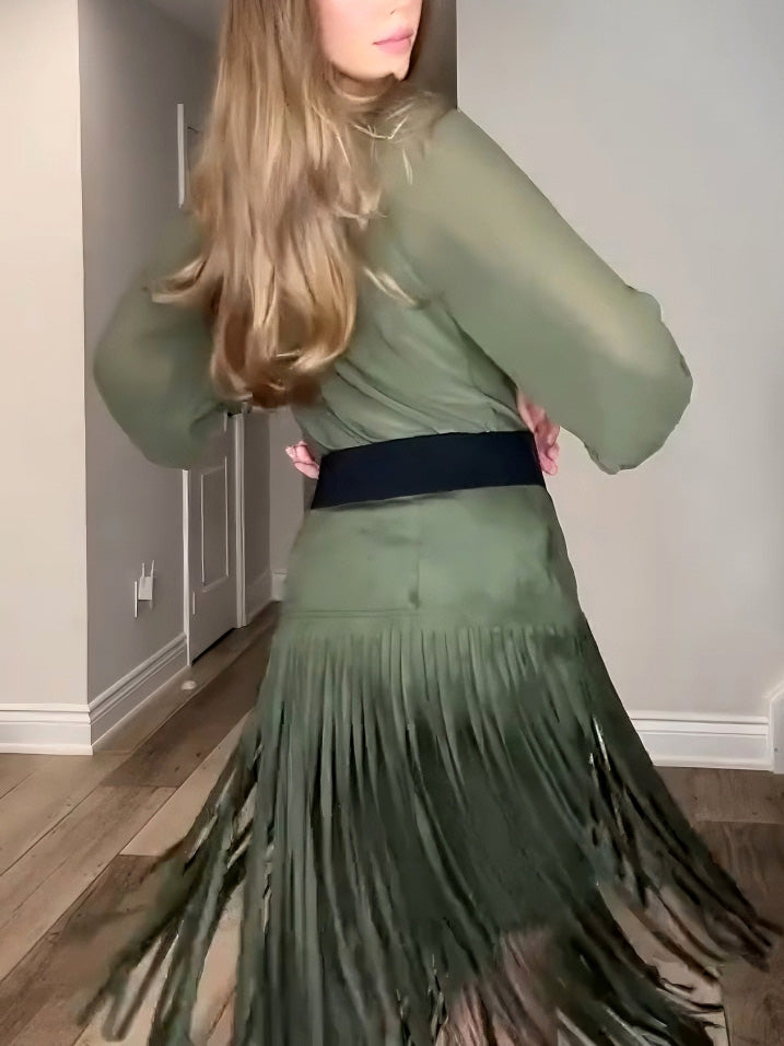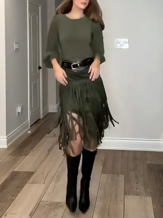 Make a stylish statement with this elegant two-piece set, featuring a refined bell-sleeve knit top paired with a high-waist fringe skirt. The soft, clean upper silhouette contrasts beautifully with the lively fringe hem, creating a balanced look that’s sophisticated, flattering, and full of movement—perfect for daily wear, outings, or special occasions.