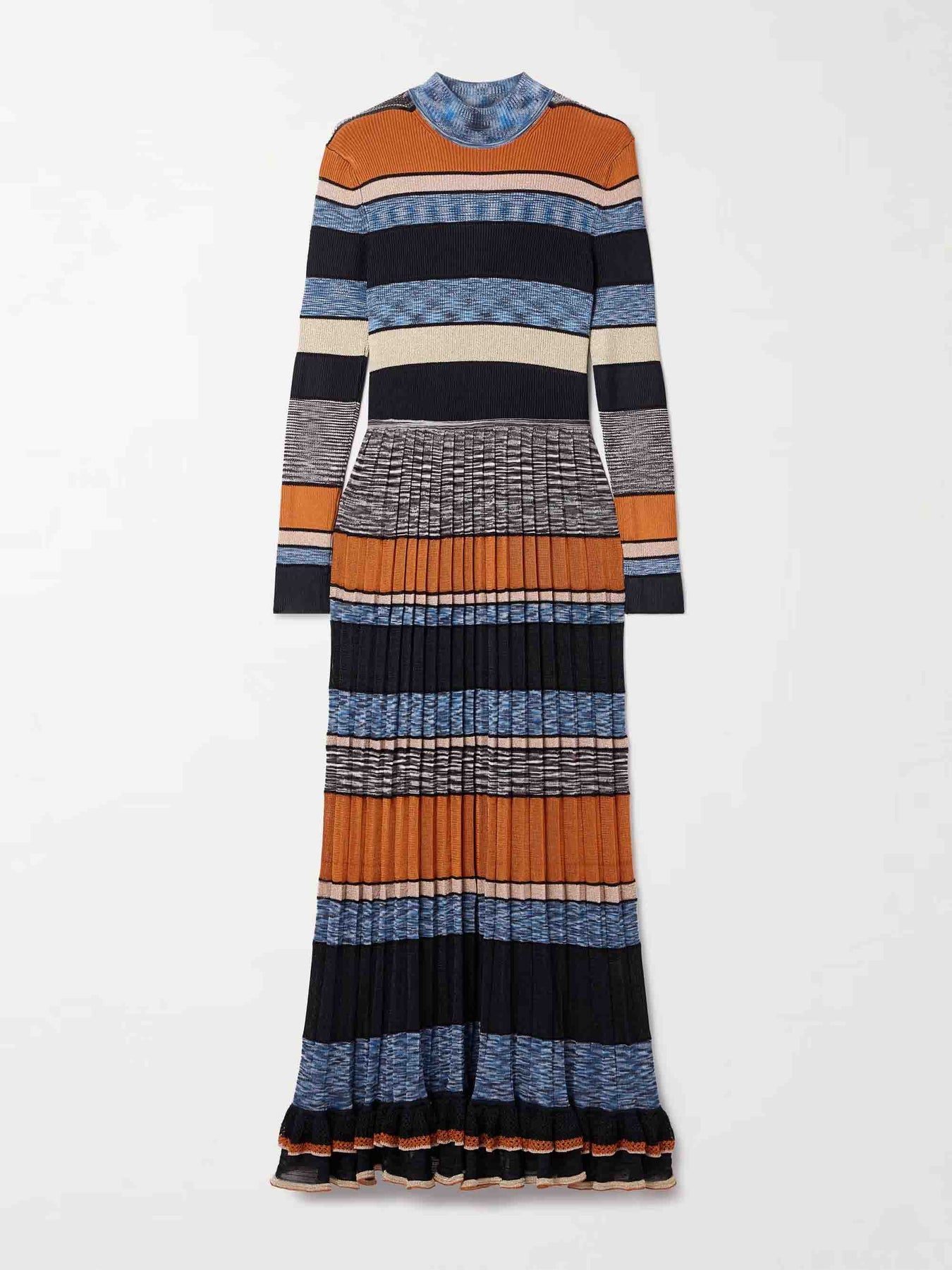 This colorful striped knit maxi dress, with its high neck and delicate ruffles, exudes elegance and creates a chic and alluring look.