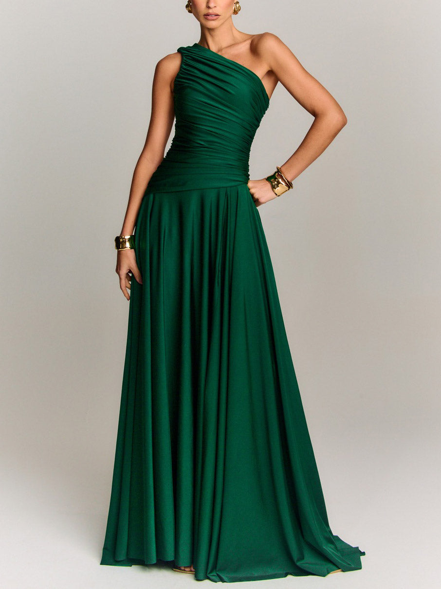 An elegant one-shoulder maxi dress featuring a draped design that flows gracefully for a sophisticated silhouette. Perfect for cocktail parties, evening events, or any occasion where timeless glamour is desired.