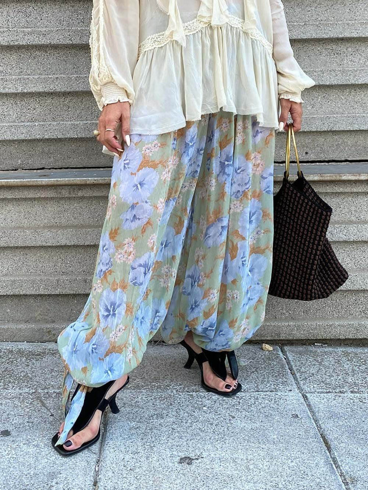 Boho Chiffon Floral Print Elastic Waist Tie-up Hem Balloon Pants