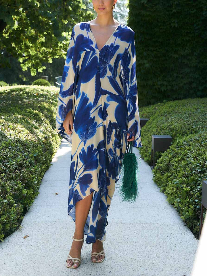 Elegant Oversized Floral Print Batwing Sleeve Chiffon Maxi Dress