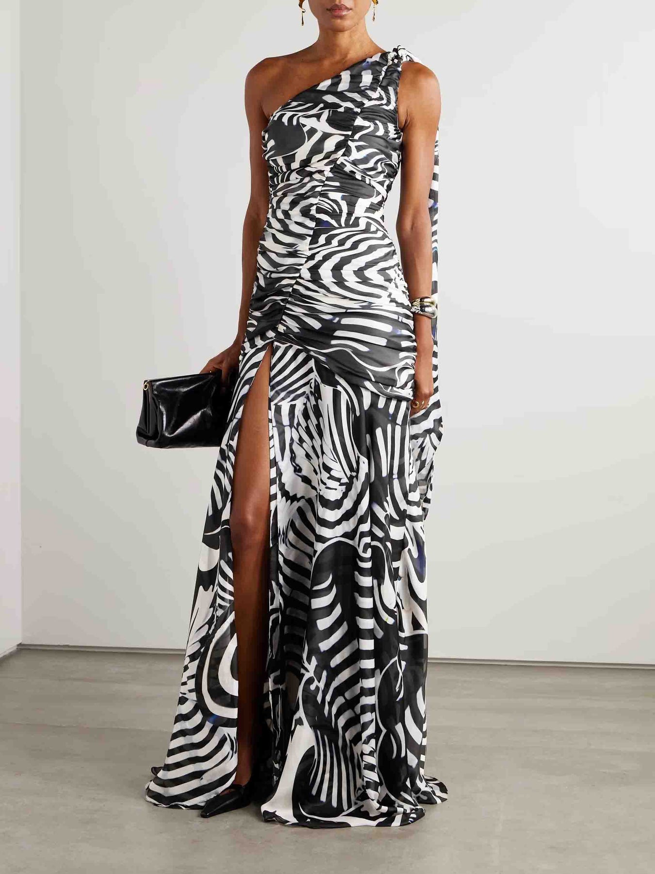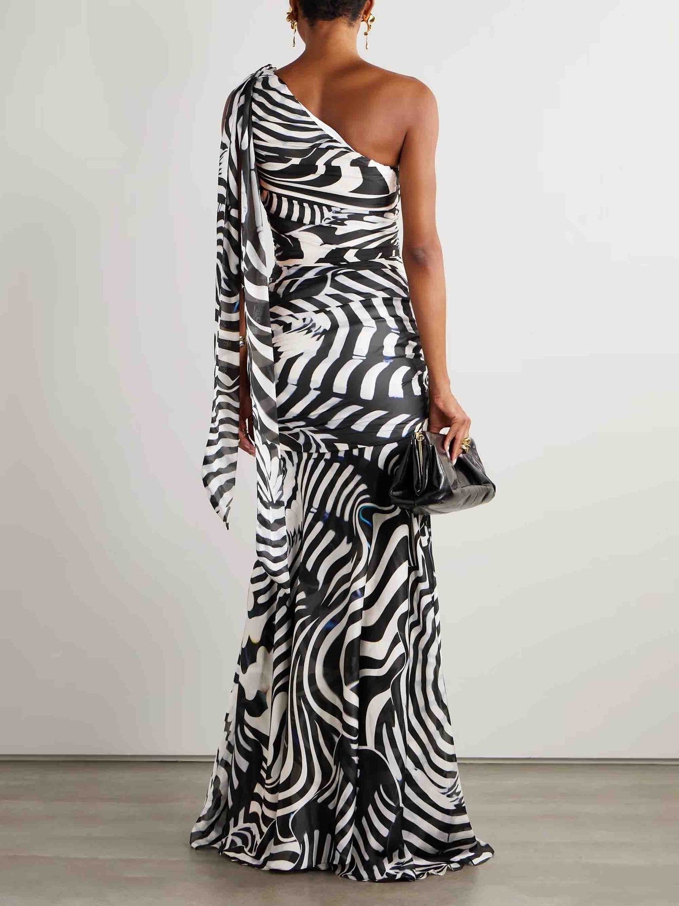 Turn heads with this elegant one-shoulder maxi dress featuring a bold animal print and lightweight chiffon fabric. Its flowy silhouette drapes gracefully for a flattering fit, perfect for evening events, parties, or special occasions.