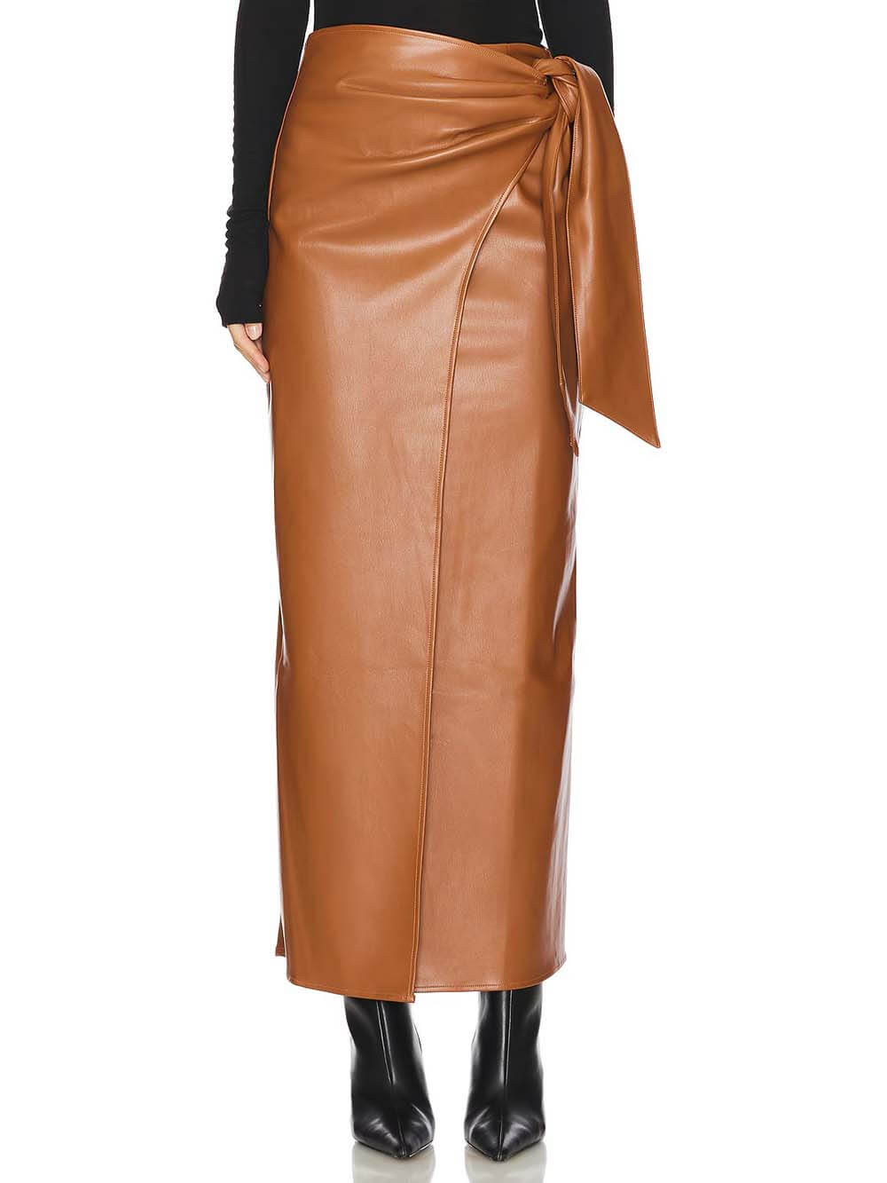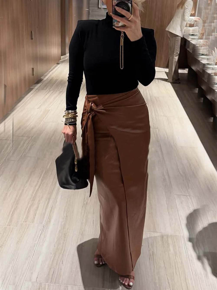 Casual Chic Faux Leather High-Waist Wrap Tie Stretch Maxi Skirt