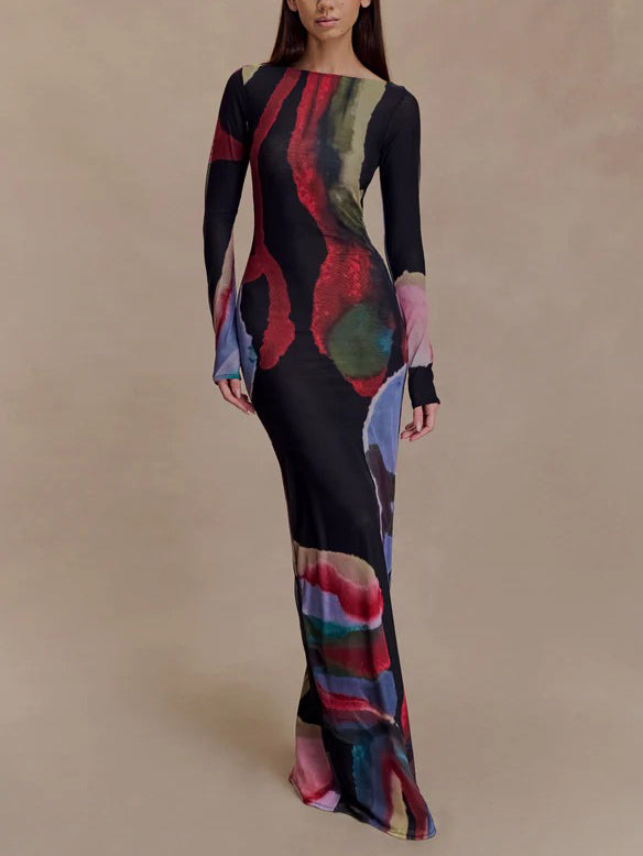 Exquisite Abstract Print Bodycon Long-sleeved Maxi Dress