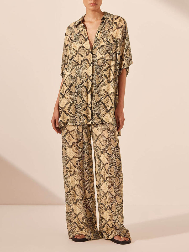 Stay stylish and comfortable in our Modern Feel Satin Unique Snake Print Button-Down Loose Shirt.