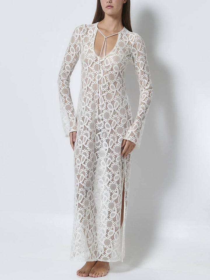 Summer Casual Lace Hook Flower Slit See-Through Holiday Lace Maxi Dress