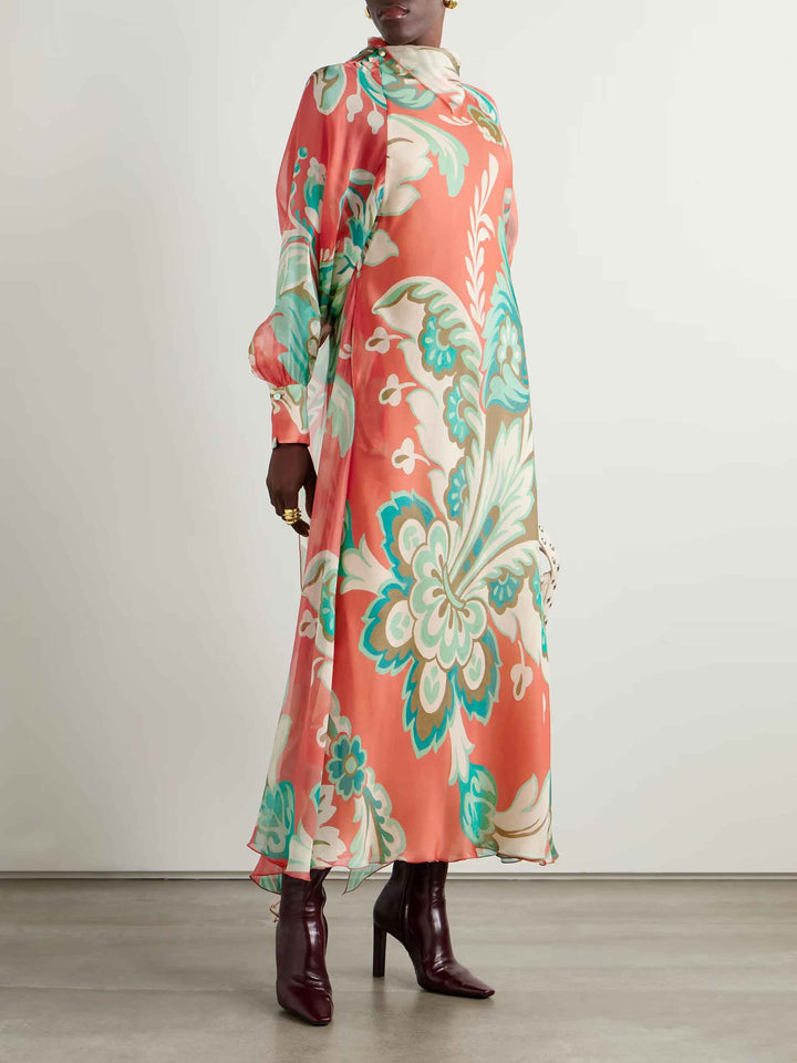 This unique draped floral-print chiffon maxi dress exudes a breathtaking elegance and effortlessness.