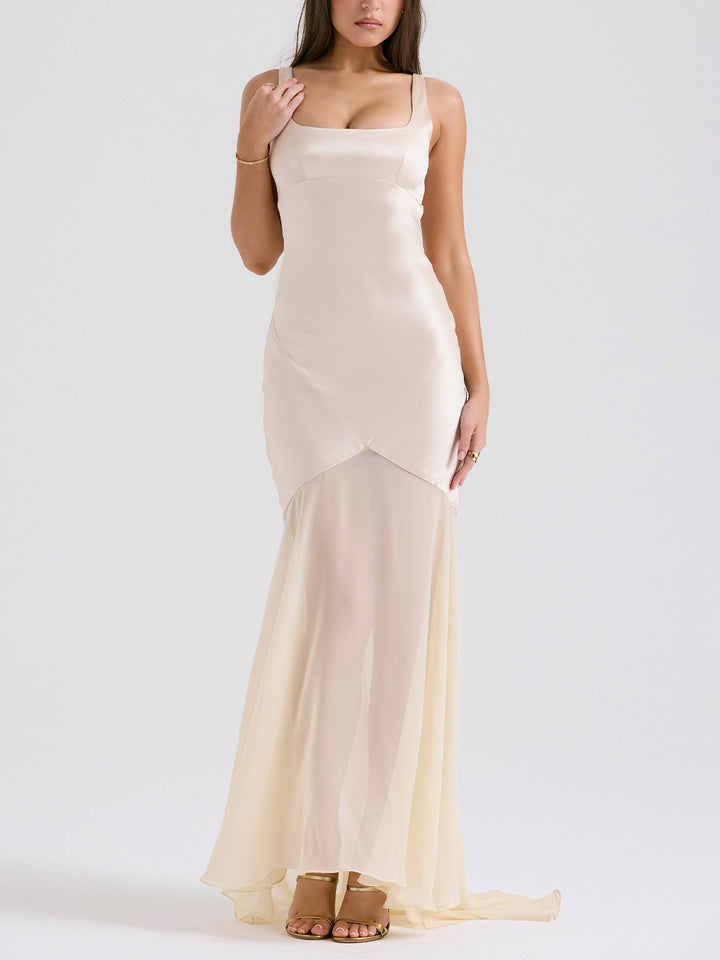 This ethereal, floor-length gown is crafted from lightweight chiffon for a timeless look. Its square neckline frames the collarbone with understated elegance.