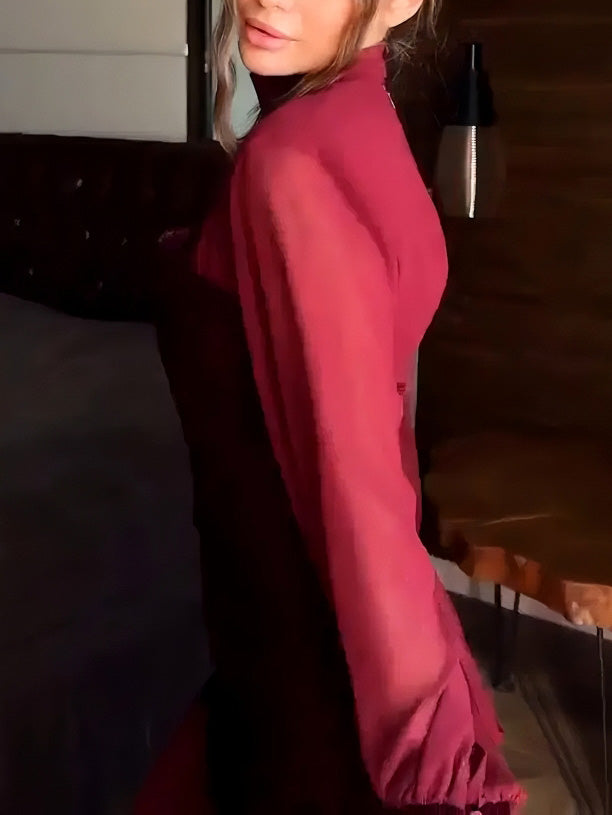 This elegant maxi dress features a sophisticated high neckline and sheer bishop sleeves. Luxurious velvet panels accent the waist, contrasting with the flowing hem for a captivating, refined silhouette. Perfect for evening gala events and formal gatherings, it exudes a touch of modern luxury.