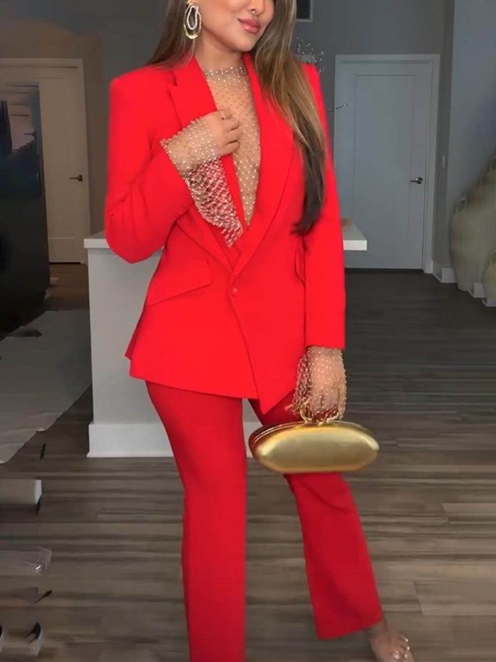 Seien Sie stilvoll und bequem in unserem einzigartigen Set mit einem Reversblazer mit einem Knopf und einer geraden Blazerhose mit elastischem Bund und Tasche.