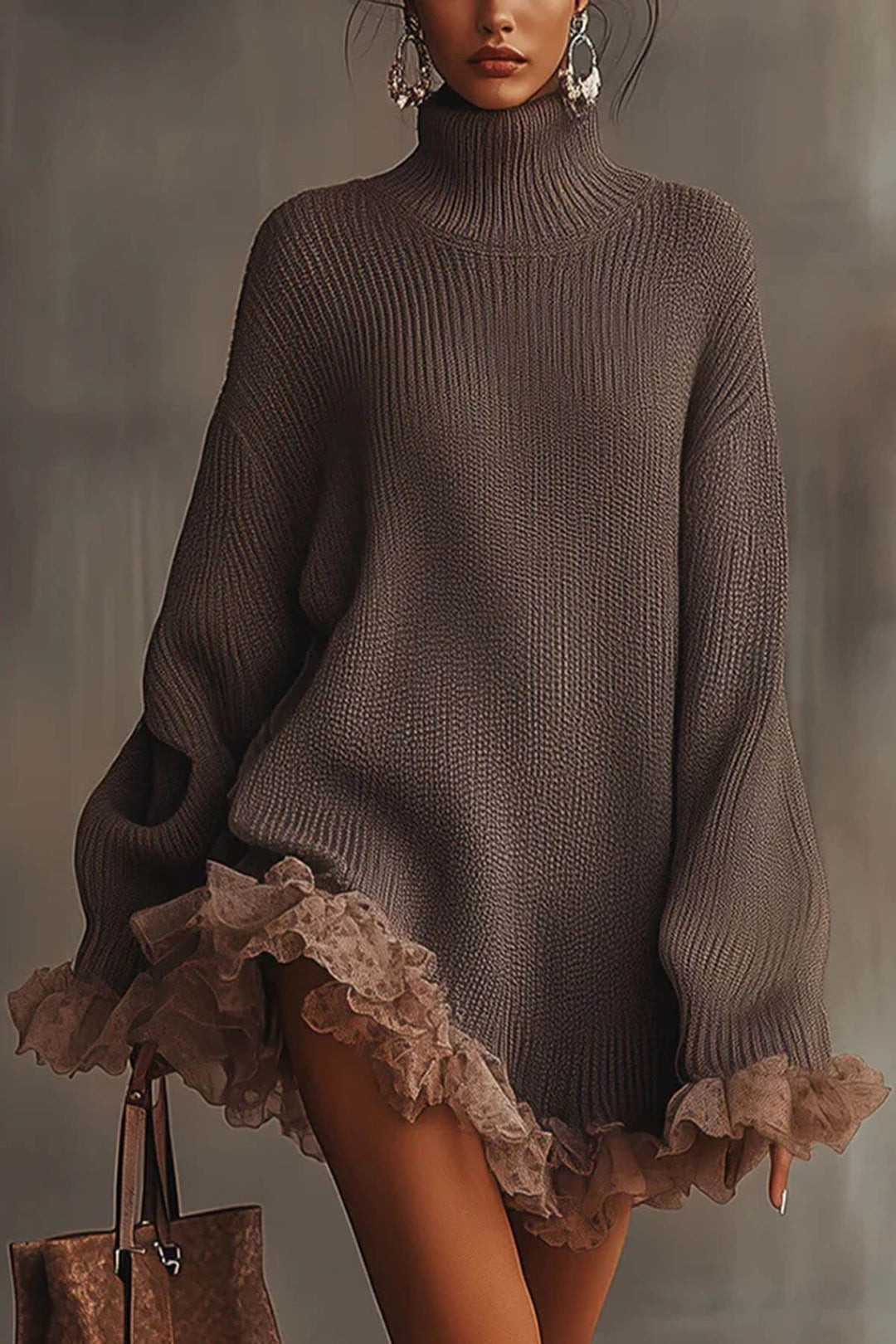 Fashion Solid Color Turtleneck Long-sleeved Loose Ruffle Knit Mini Dress