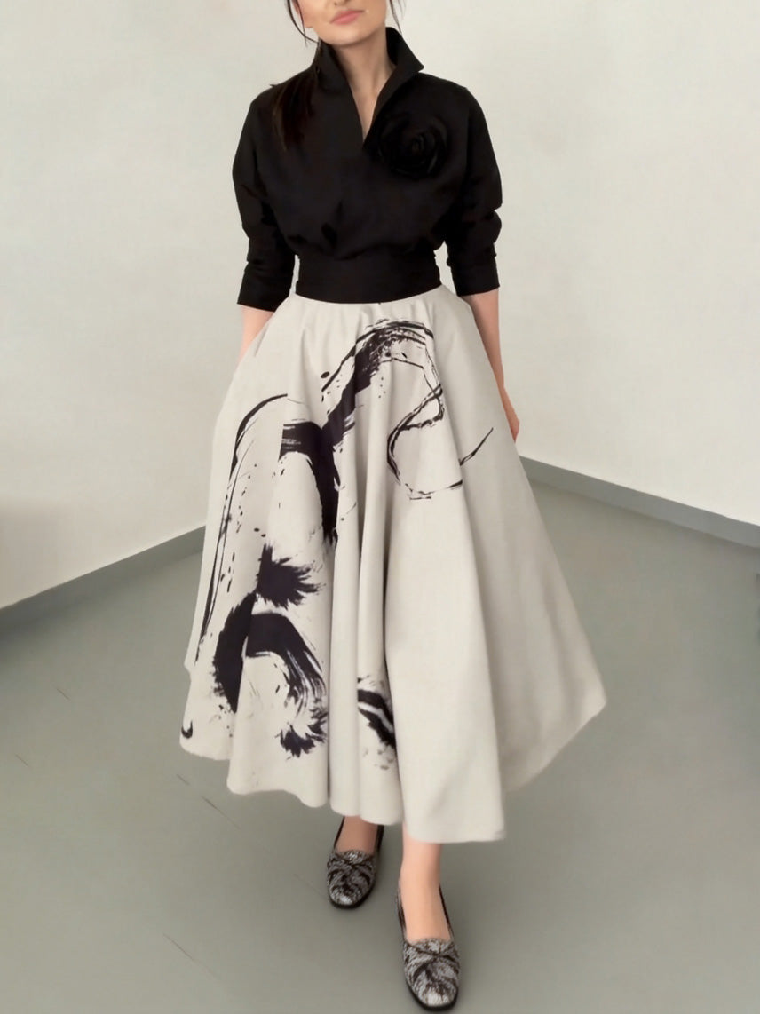This stylish two-piece set features an abstract print fabric with a modern art style, paired with a flowing A-line maxi skirt. Modern and eye-catching, it's the perfect choice for creating an elegant everyday look.
