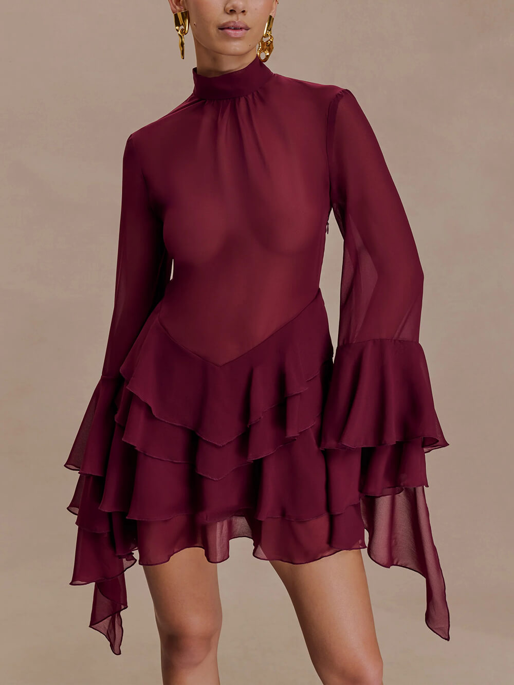Step into effortless femininity with this elegant mini dress, featuring delicate layered chiffon and cascading ruffle details. The lightweight fabric creates graceful movement, while the flirty mini length adds a playful, modern touch. Perfect for brunches, parties, or special daytime occasions, this dress combines romantic charm with contemporary sophistication. Pair with strappy heels or chic flats for a polished, stylish look.