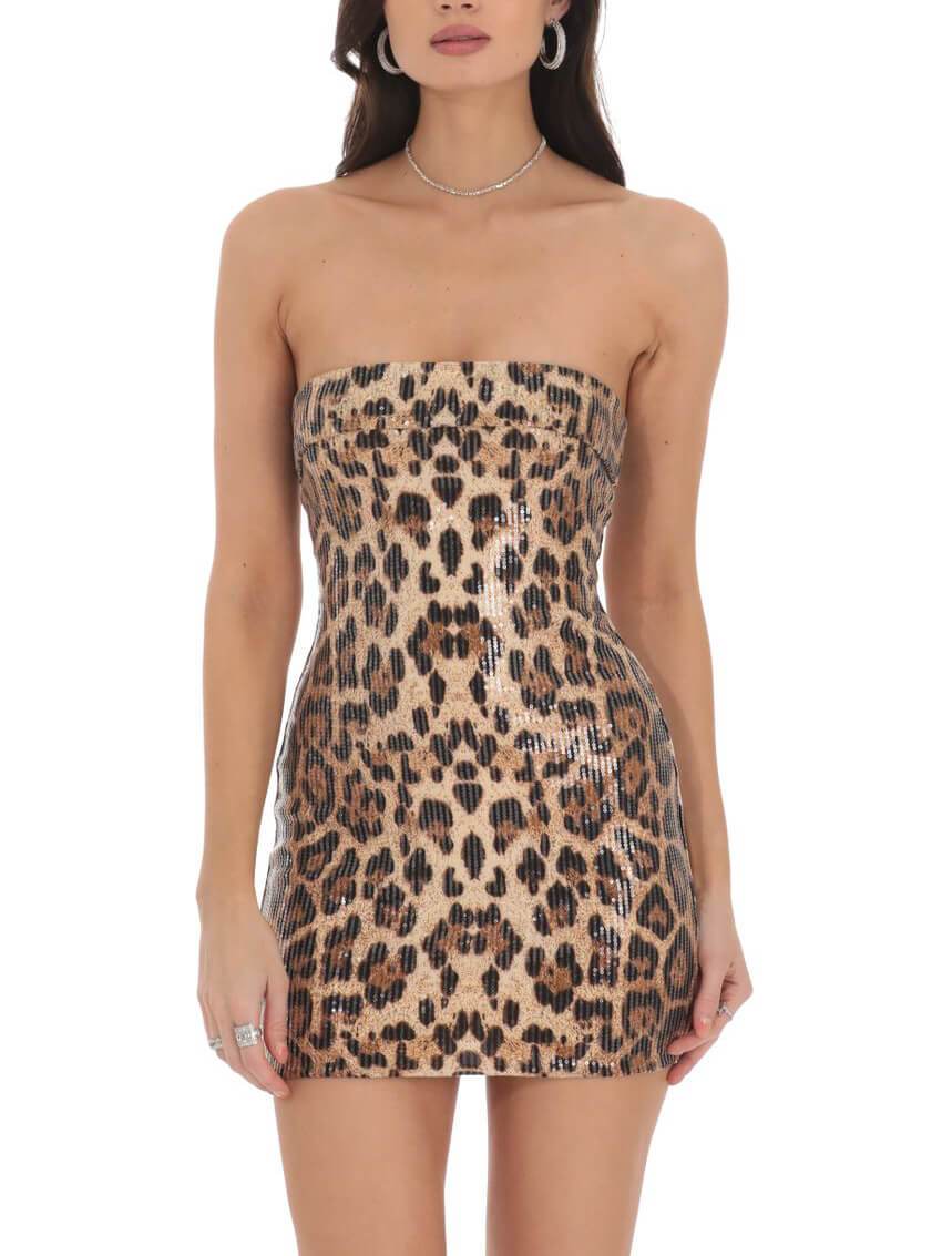 Αποκτήστε μια κομψή και άνετη εμφάνιση με το μίνι φόρεμα Bandeau Sequin Leopard.