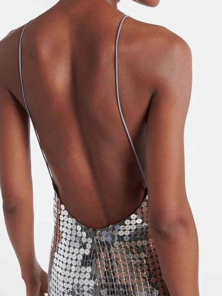 This stunning dress, embellished with dazzling sequins, shimmers brilliantly in the light. The plunging V-neckline adds a touch of sophistication, while the bold, open back creates a captivating, feminine allure.