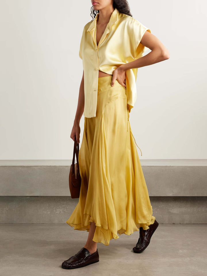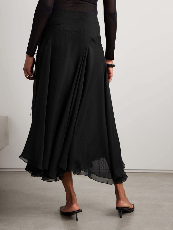 This asymmetrical chiffon maxi skirt is elegant and dynamic, detailed with delicate pleats and cascading layers for a fluid silhouette.