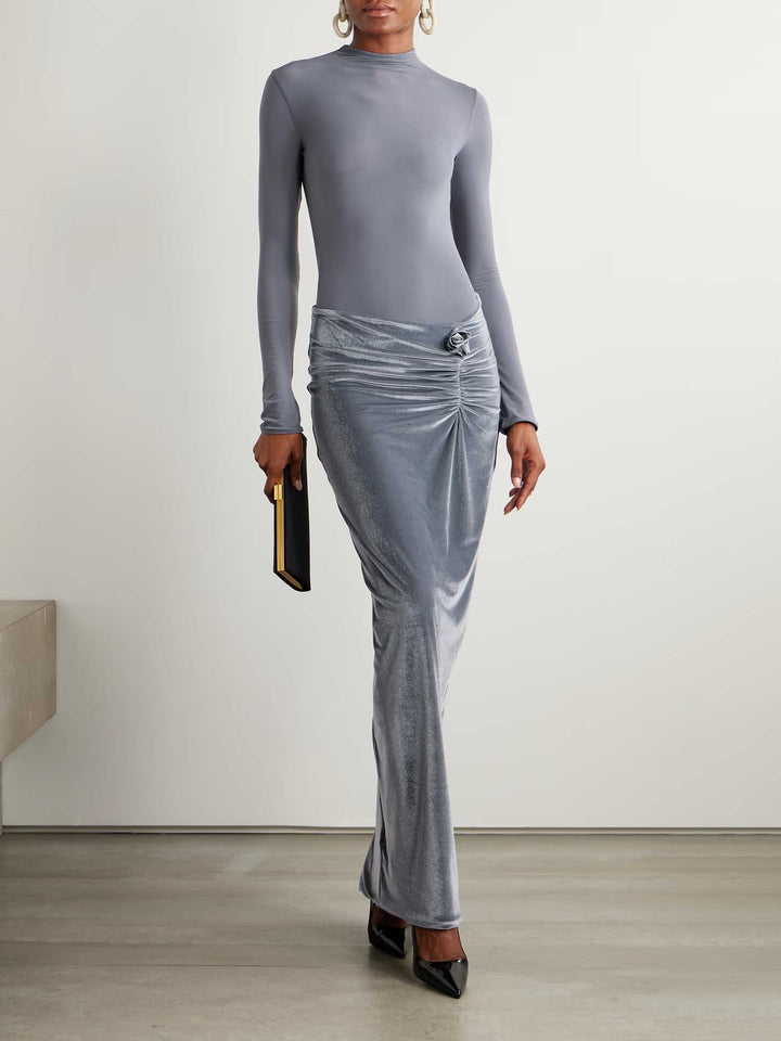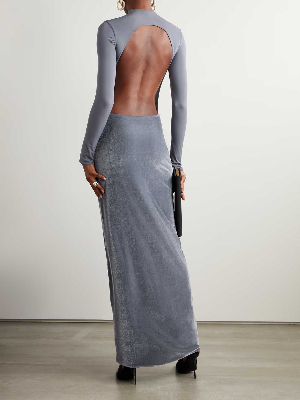 An elegant velvet maxi dress featuring a graceful pleated design and a striking open-back detail. Combining timeless sophistication with alluring charm, this dress is perfect for evening parties, formal occasions, or special celebrations.