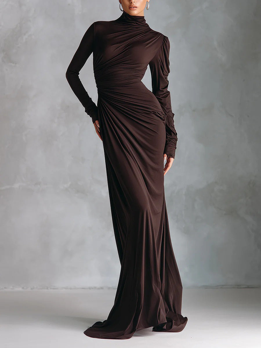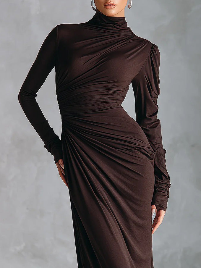 Exquisite Turtleneck Pleated Pocket Maxi Dress