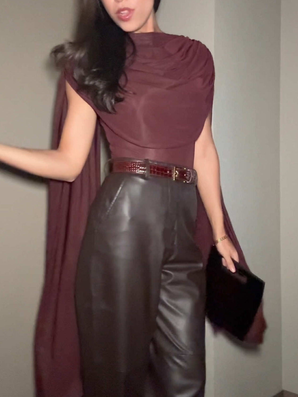 A sophisticated two-piece set combining a beautifully draped cape-sleeve top with high-waist wide-leg faux leather pants. The flowing top adds drama and elegance, while the structured pants balance the look with modern refinement. Perfect for upscale events, dinners, or chic everyday styling.