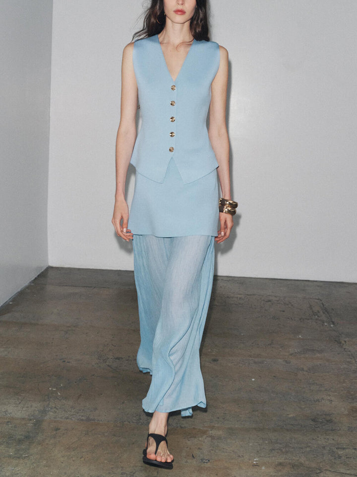 Elegant Mesh Panel Pleated Knit Maxi Skirt