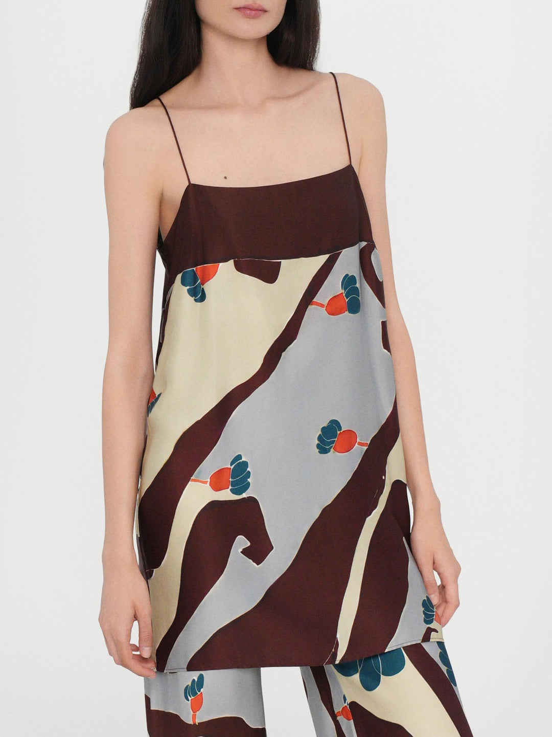 Crafted from smooth satin, this tank top showcases a striking abstract floral print that blends artistry with elegance. Its lightweight, silky texture offers a luxurious feel, while the vibrant design adds a modern edge. Perfect for pairing with tailored bottoms or casual denim, this versatile top elevates both day and evening looks.
