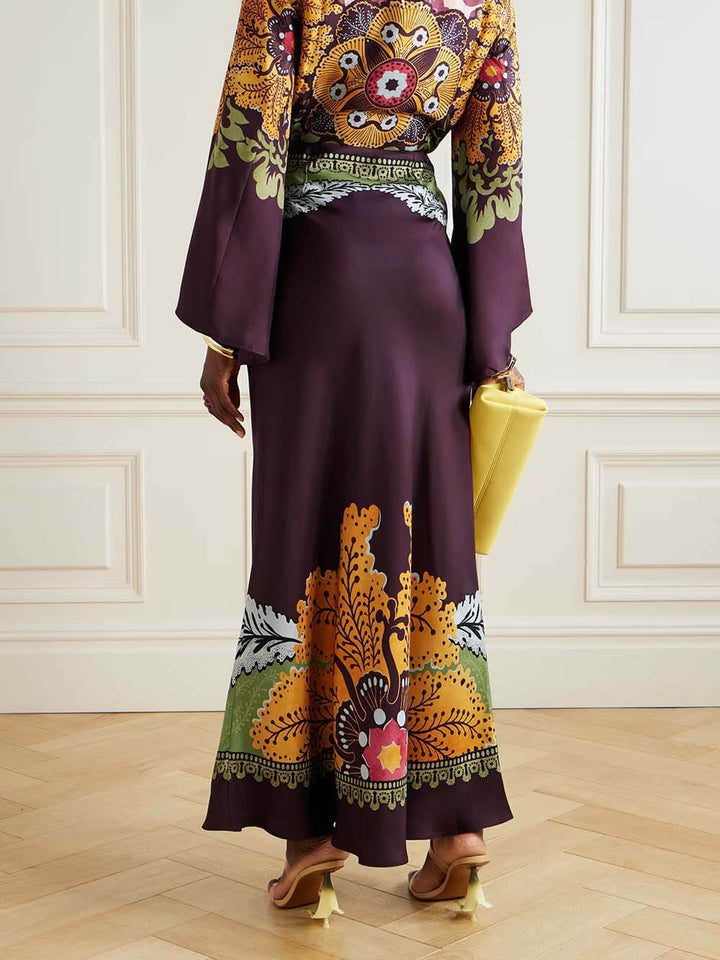 Retro Ethnic Print Satin Twill Maxi Skirt