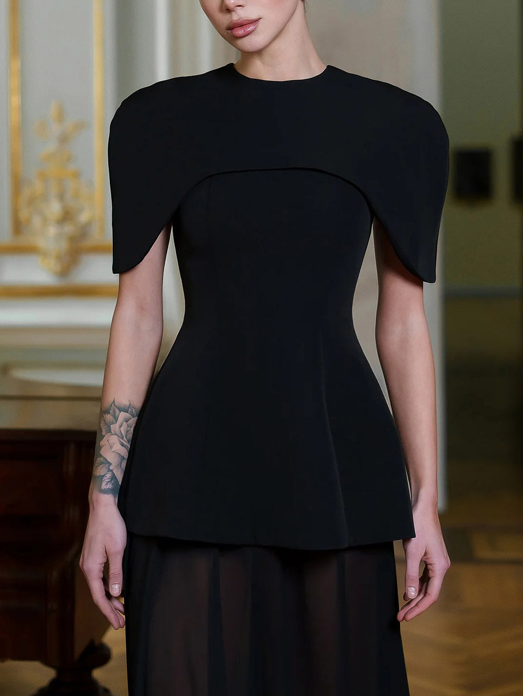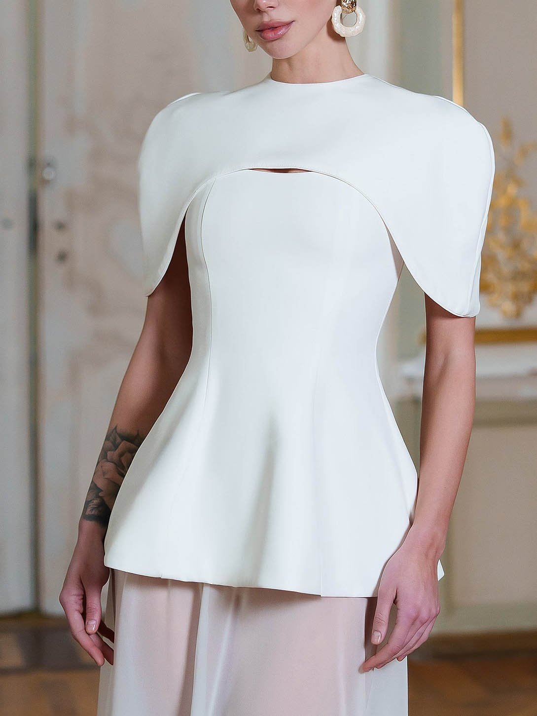 Elevate your formal wardrobe with this exquisite two-piece set, featuring a structured peplum top adorned with a sophisticated cape detail and a subtle front cutout. The flowing wide-leg pants add graceful movement and refined elegance, creating a perfectly balanced silhouette. Ideal for upscale events, evening occasions, or any moment that calls for timeless sophistication.