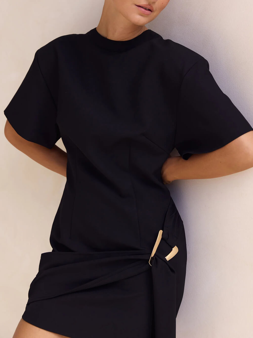 Elevate your look with this classic yet modern mini dress, designed with a striking gold ring accent that gathers the fabric into soft, flattering drapes. The minimalist silhouette is enhanced by luxurious detailing, creating a refined and fashion-forward statement. Perfect for nights out, special events, or any moment that calls for effortless sophistication, this draped mini dress combines elegance, confidence, and contemporary charm in one unforgettable piece.