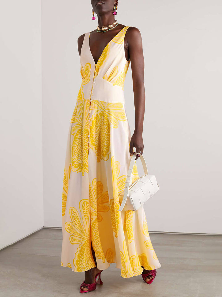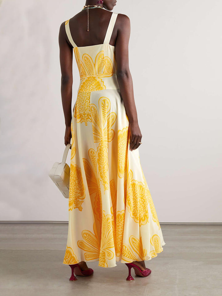 Elegant Pineapple Print Satin Crepe Maxi Dress