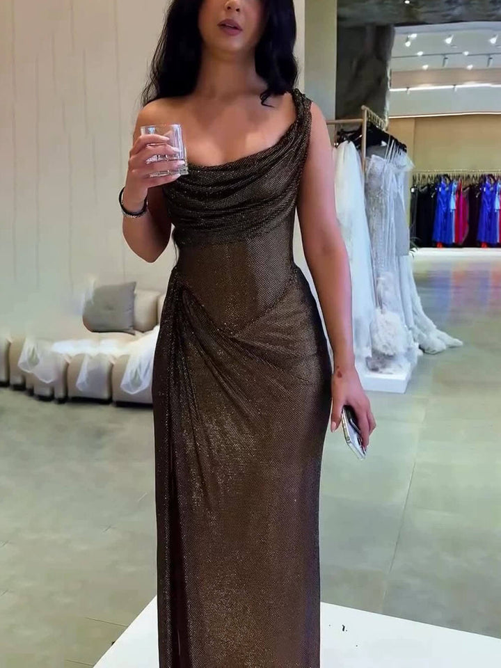 Elegant Sequins One-Shoulder Slit Pleats Evening Maxi Dress
