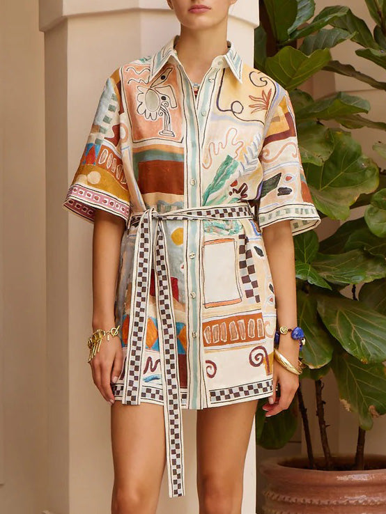 Show your artistic side with this unique abstract art print shirt dress. Designed with short sleeves, a button-down front, and a matching belt to define the waist, it blends creativity and elegance effortlessly—perfect for casual days, vacations, or stylish city strolls.