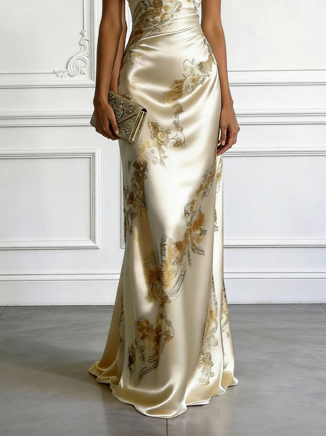 Elegant One-shoulder Floral Satin Maxi Dress