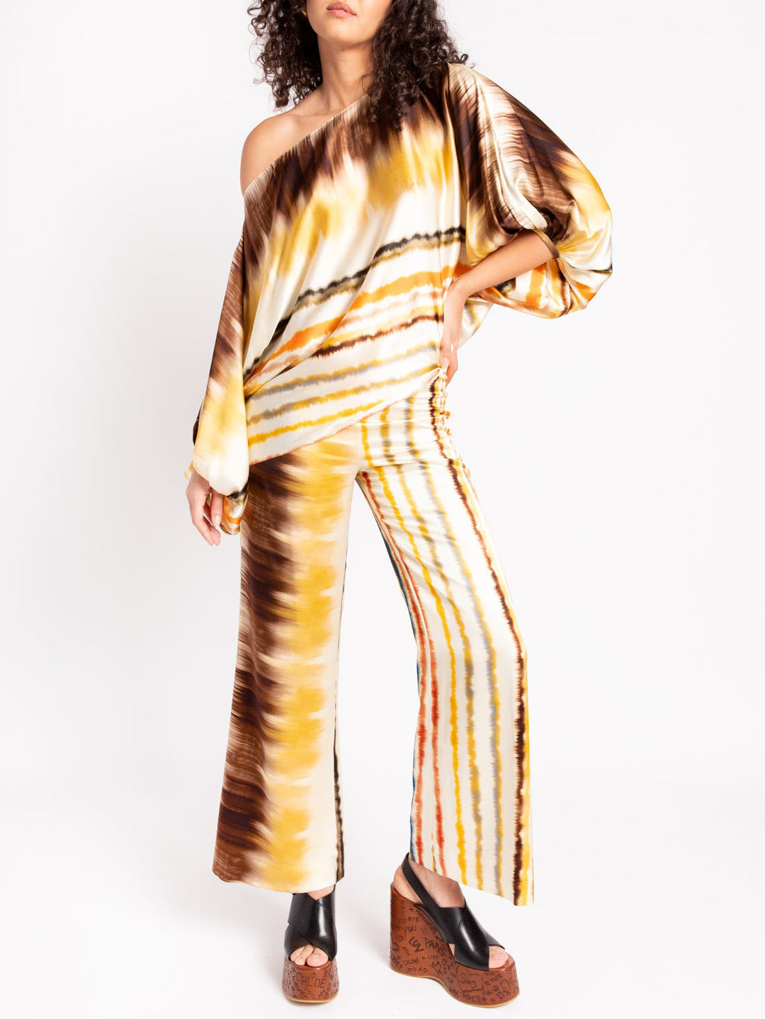 Sleek and fluid, these satin trousers are printed in a flattering gradient stripe pattern that blends structure with softness. The loose, wide-leg silhouette adds a bold and elegant touch to any wardrobe.