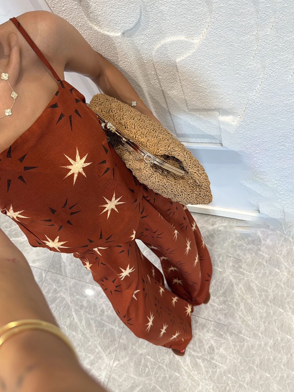 Bring a touch of celestial elegance to your everyday style with this beautifully crafted two-piece set. Featuring a delicate star-print cami top paired with flowing wide-leg pants, this outfit blends comfort, charm, and modern sophistication. Lightweight cami top with adjustable straps for a personalized fit. Perfect for vacations, brunch dates, casual outings, or stylish lounging.