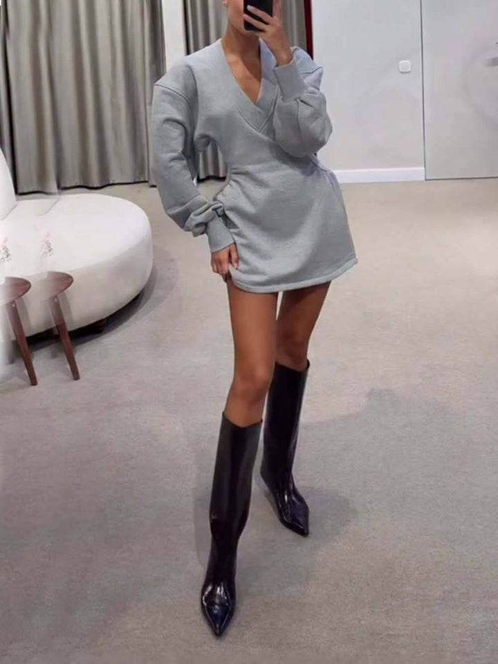 Step out in effortless style with this casual ribbed mini dress. Featuring a flattering V-neck, long sleeves, and a cinched waist, it combines comfort with chic, sporty charm. Perfect for daytime strolls, casual outings, or relaxed weekends, this versatile dress pairs seamlessly with sneakers or ankle boots for a laid-back yet polished look.