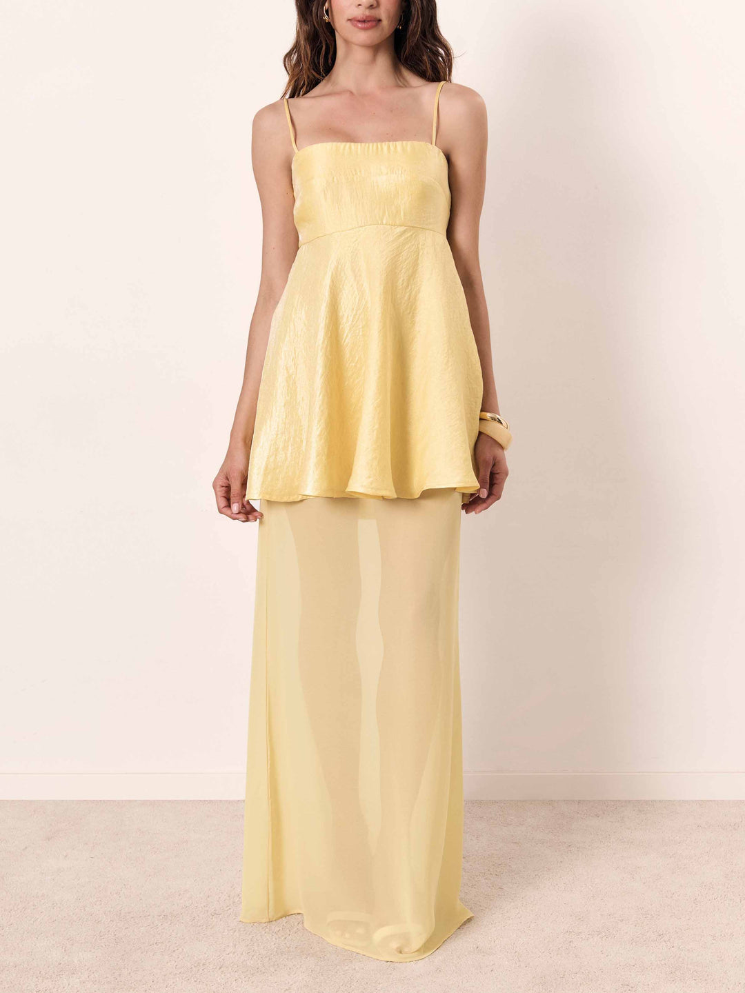 The fitted spaghetti strap top exudes a subtle sheen, while the flared skirt is decorated with ruffles for a playful and sophisticated look. Paired with the lightweight sheer maxi skirt, it creates a fresh and sunny aesthetic.