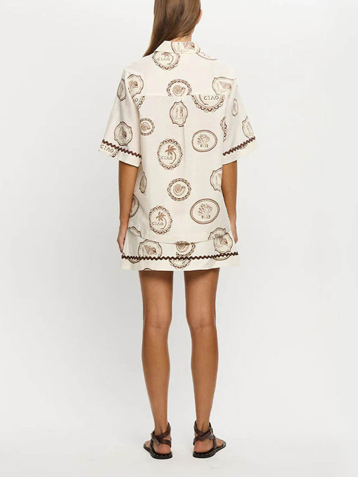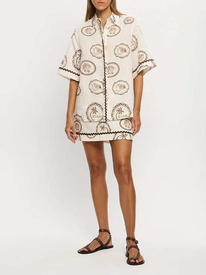 Elegant Lace-Up Linen Shell Print Short-Sleeved Shirt And Skirt Set