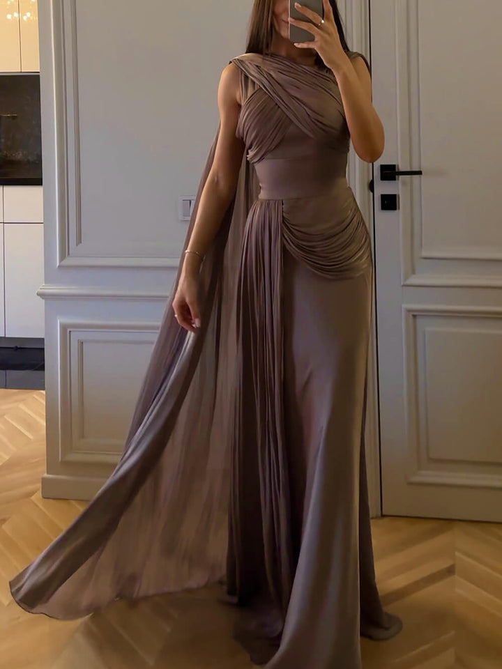Elegant Draped Sash Satin Evening Gown Maxi Dress