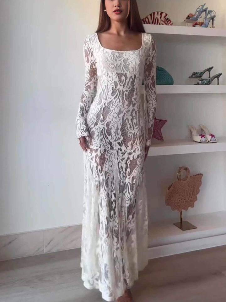 Exquisite Lace Square-neck Long-sleeved Maxi Dress