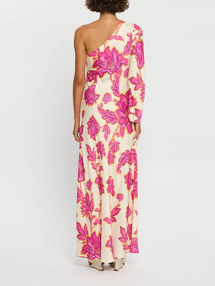Unique Satin Floral Print One Shoulder Flared Maxi Dress