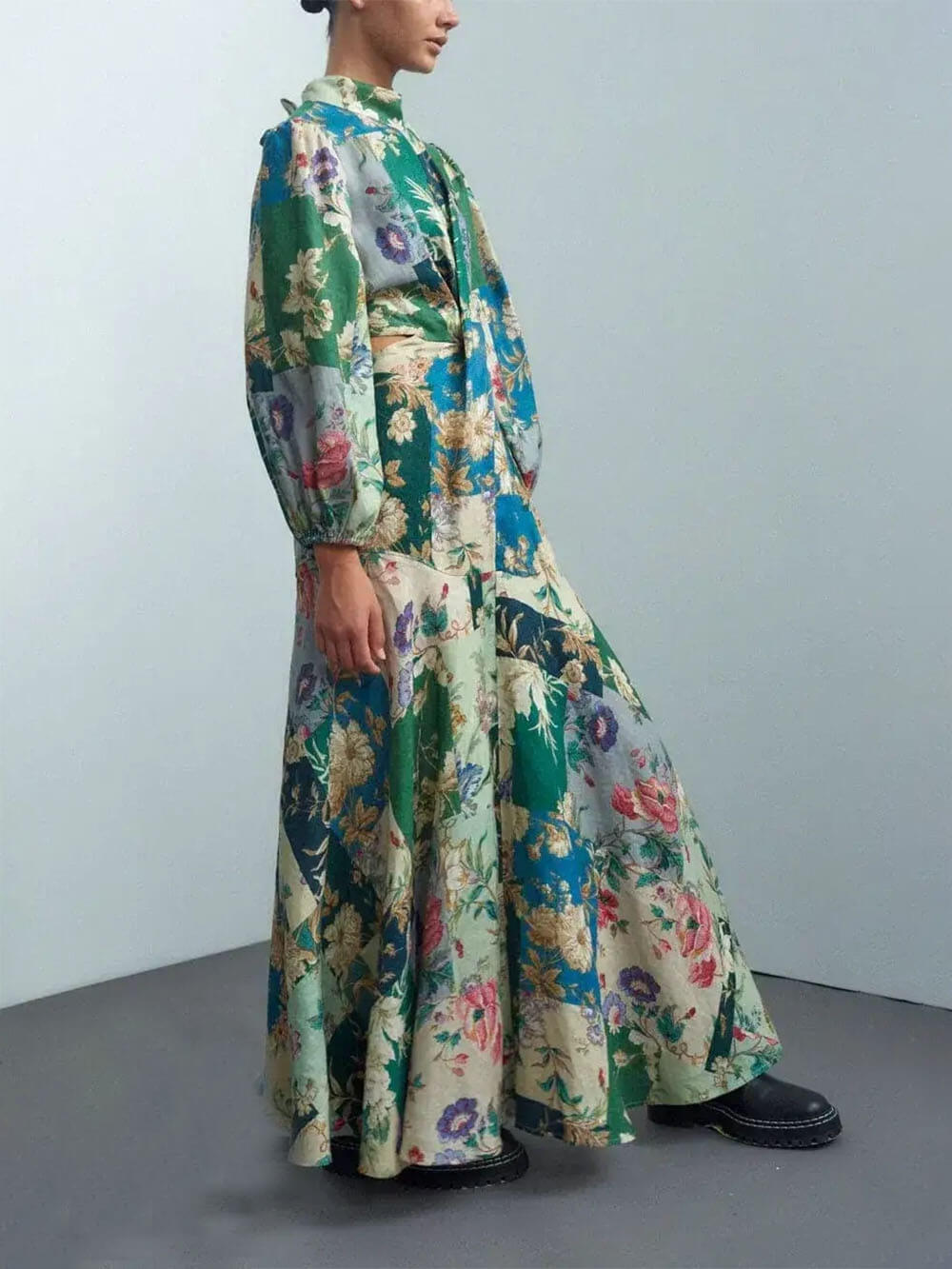 Delicate Floral Print Tie-Back Lantern Sleeve Maxi Dress