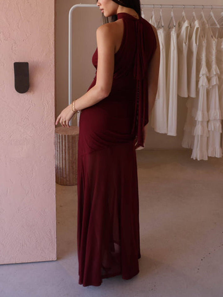 Fresh Style Mesh Paneled Pleated Bow Tie Maxi Dress