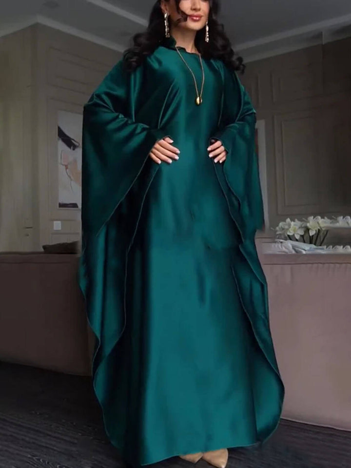 Elevate your wardrobe with our Elegant Satin Batwing Sleeve Belted A-Line Maxi Dress. The batwing sleeves add a touch of sophistication, while the belted waist accentuates your figure for an effortlessly chic look. Suitable for various occasions—dress it up for formal events or style it casually for brunch outings.