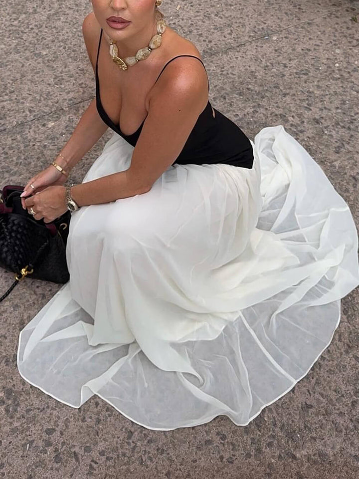 Elegant Color-Block Spaghetti Strap Backless Maxi Dress