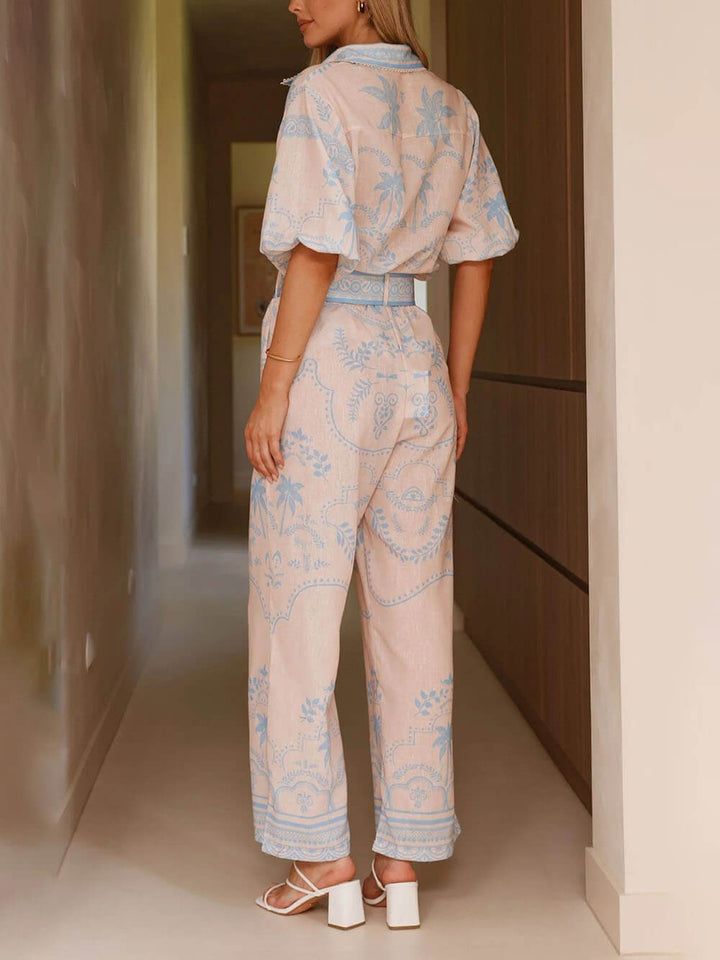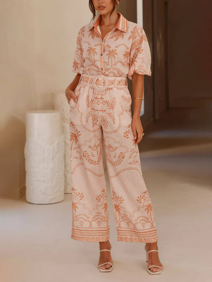 Stay stylish and comfortable in our casual and elegant printed linen short sleeve top and belted straight pants set.