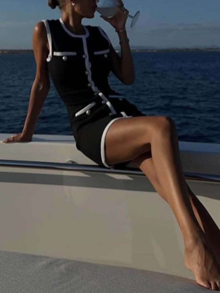 La « mini-robe sans manches à boutons et boutons exquis » présente un design élégant qui combine des couleurs unies avec un motif à empiècements.